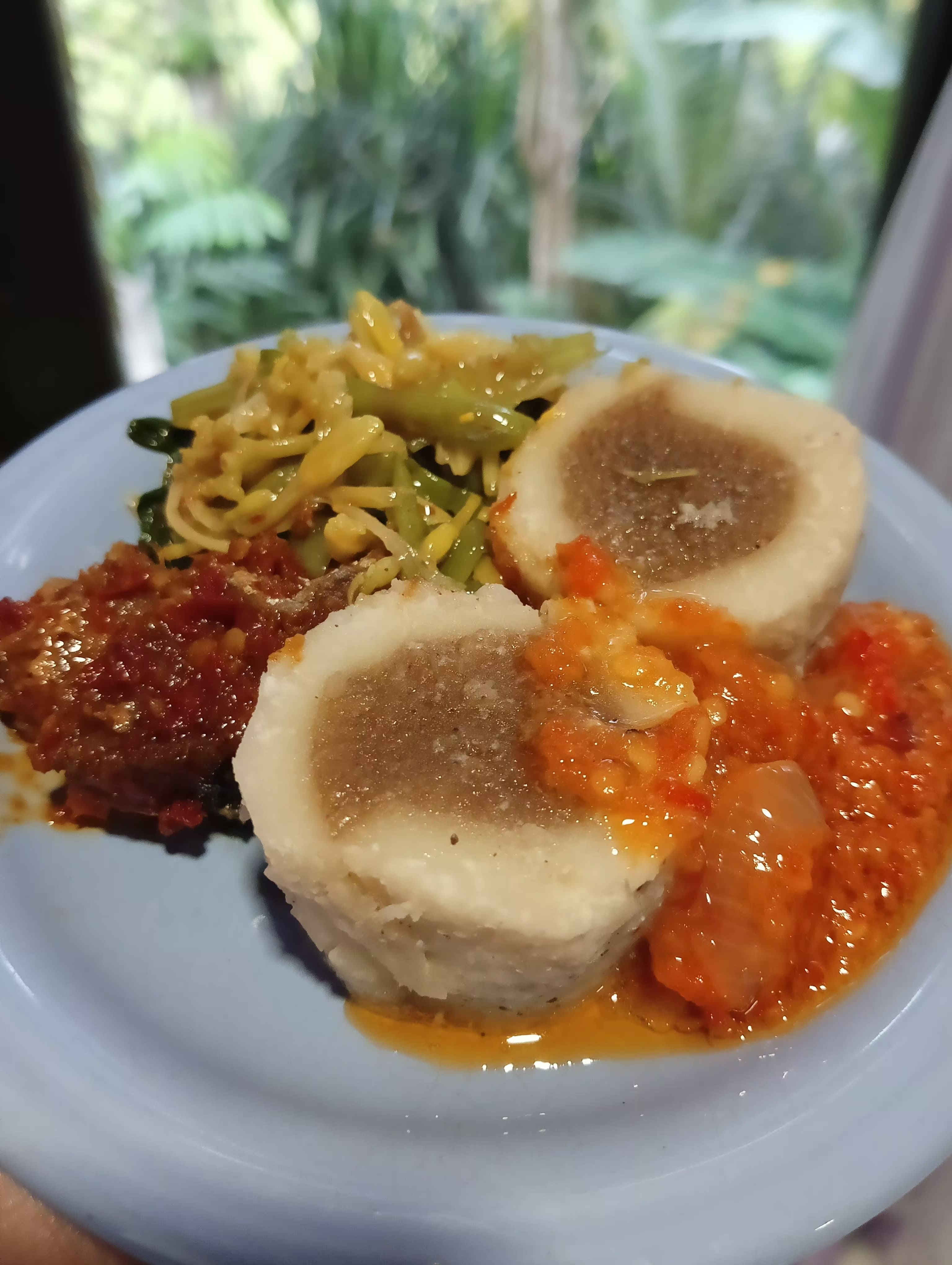 Perpaket berisi keladi PNG, sayur kangkung bunga pepaya, ikan saus, dan sambal.